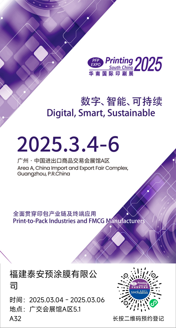 దక్షిణ చైనాను ముద్రించడం మార్చి 4-6, 2025 న గ్రాండ్ ఓపెనింగ్ అవుతుంది, ఇది దక్షిణ చైనాలో ప్రింటింగ్ మరియు ప్యాకేజింగ్ పరిశ్రమ యొక్క వార్షిక కార్యక్రమం, మరియు మా థర్మల్ లామినేషన్ ఫిల్మ్ యొక్క బలం స్థాయిని మరియు తాజా శాస్త్రీయ పరిశోధన విజయాలు చూపించడానికి ప్రతి సంవత్సరం మేము ప్రతి సంవత్సరం పాల్గొనే ప్రదర్శన.